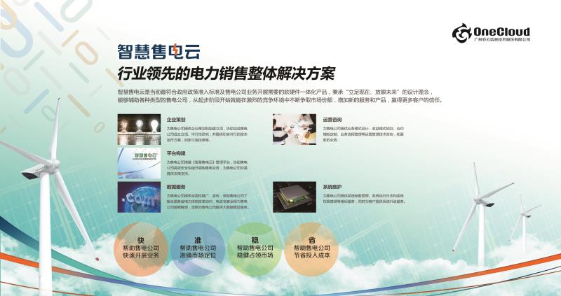 目前該公司的產品有:售電量大數據智能預測系統-小智一號:對售電量的影響因素進行全面、精確的分析,選取行業、用戶類型、季節、溫濕度、節假日、市場變化、企業的生產狀況等指標,實現售電量的精準預測,為售電公司在電力交易中進行售電量申報提供重要依據。該產品于2017年6月份獲“中國大數據產業生態聯盟”頒發的“大數據應用產品認證”證書。