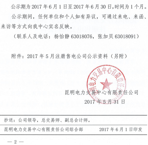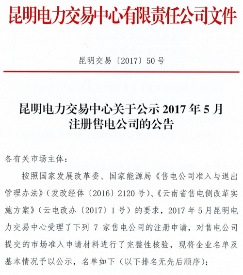 昆明電力交易中心發布了《關于公示2017年5月注冊售電公司的公告》,此次共有7家售電公司進入名單,詳情如下:昆明電力交易中心關于公示2017年5月注冊售電公司的公告