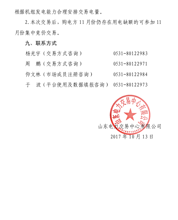 2017年10月13日山東電力交易中心發布11月份電力直接交易(雙邊協商)公告。將于2017年10月17日8:50-11:50組織雙邊協商交易,交易標的為所有準入的購電方2017年11月份用電量減去已簽訂年度雙邊合同當月電量后的全