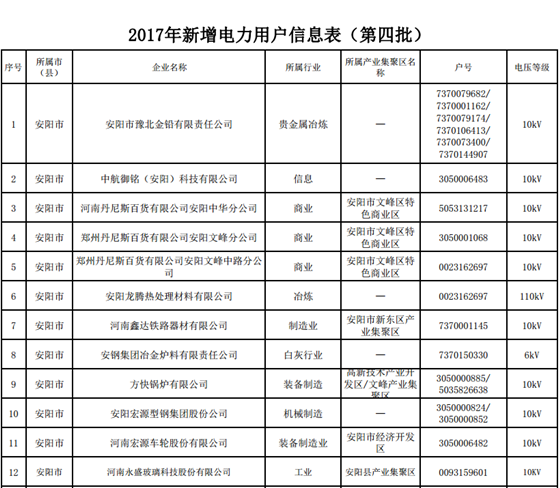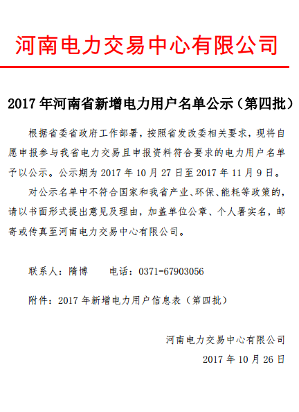 10月26日,河南電力交易中心發布《2017年河南省新增電力交易用戶名單公示(第四批)》,共608家電力用戶。公示期為 2017年10月27日至2017年11月9日。