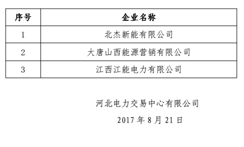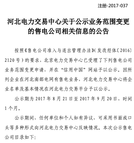 從河北電力交易中心獲悉,日前河北電力交易中心發布了關于公示業務范圍變更的售電公司相關信息的公告。北京電力交易中心已受理了包括北杰新能有限公司等3家售電公司業務范圍變更申請,并在信用中國網站予以公示。