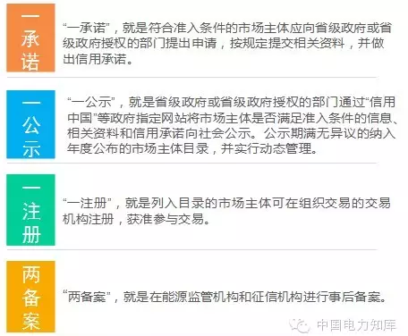 按照簡政放權的原則,《實施意見》對售電側市場的準入和退出機制作了創新性安排,這是新一輪電力體制改革中的一個亮點。準入機制方面,將以注冊認定代替行政許可的準入方式,以降低行政成本,實現有效監管,提升工作效率,重點是“一承諾、一公示、一注冊、兩備案”。
