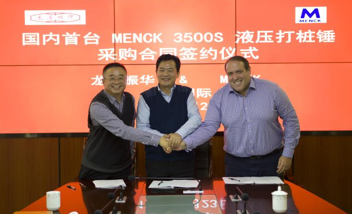 2017年11月23日,國內(nèi)首臺MENCK 3500S 液壓打樁錘采購合同簽約儀式在龍源振華公司舉行,這是龍源振華公司首次與MENCK GmbH公司達成合作協(xié)議,結(jié)成戰(zhàn)略同盟伙伴。