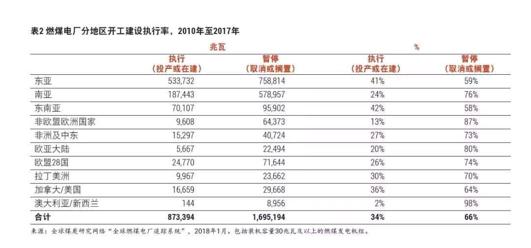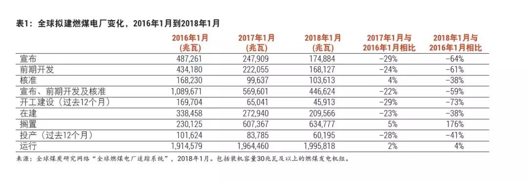 類似地,Steven Davis和Robert Socolow在基于他們對普氏全球發電廠數據的分析之后報告了燃煤電廠的退役年齡中位數為37年。Davis andSocolow, "Commitment accounting of CO2 emission," 環境研究通訊 (2014)在過去的數十年中,每年新增機組容量超過退役機組容量,這導致了全球燃煤電廠機組持續增長。但近期數據顯示,新審批通過、開工建設的燃煤電廠及電廠建設執行率等指標均顯示燃煤電廠新增機組已大幅衰減。同時,老舊機組的退役速度則持續上升。兩者最終導致全球燃煤電廠裝機總量停止增長。若以目前趨勢發展,可以預見在2022年燃煤電廠的退役速度將會超過其新建速度,全球燃煤電廠的規模將會隨之開始減少。如表1所示,關于燃煤電廠建設活動的各項指標顯示出衰減趨勢。至2018年1月,這些指標顯示出: