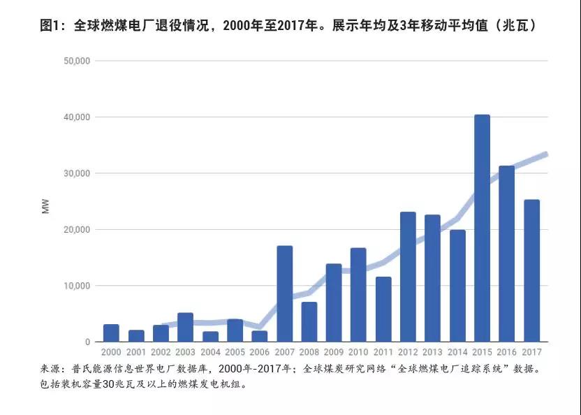 若想評估全球燃煤電廠的未來情況,同時參考開工建設情況和機組退役趨勢這兩個指標比僅使用開工建設數據更加有效。如圖1所示,在過去的20年中,燃煤電廠機組的退役趨勢出現了大幅的上升。在過去三年(2015-2017)中共97,193兆瓦機組退役,2012-2014年共有65,877兆瓦機組退役,而2009-2011年共有42,334兆瓦機組退役。