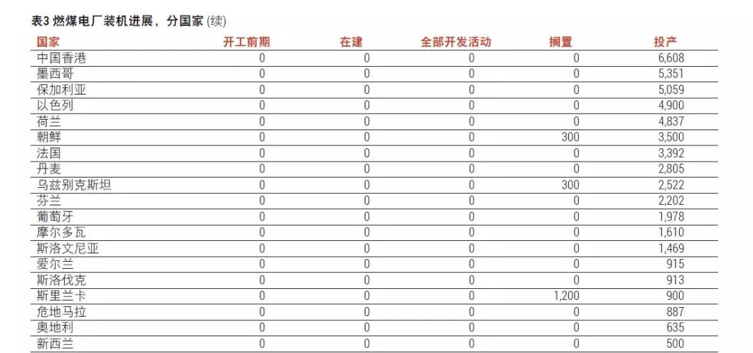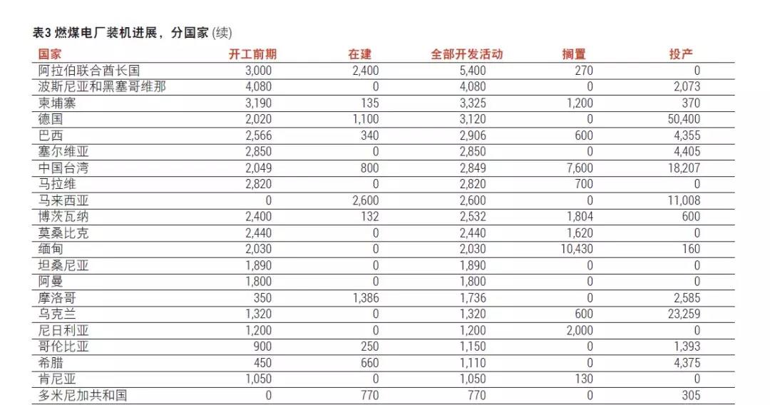 中國:在2006至2017年間,中國共投產了692吉瓦的燃煤電廠,這一數字超過世界其他國家裝機容量總和的兩倍。其中,在2015至2016年間由省政府直接批準的大量燃煤電廠項目正在削弱該國的可再生能源發展目標,也導致電力過剩危機的出現。對此,中央政府開始在2016年限制新燃煤電廠項目的審批,出臺了一份幾乎包括全部省份的限令(貧困地區和民生熱電項目除外)。在2017年政府暫停了數百個燃煤電廠項目,其中一月份暫停了98吉瓦,九月份暫停了93吉瓦(其中有21吉瓦為二者重合)。2016年和2017年的這些限令總共暫停了444吉瓦處在不同建設階段的燃煤電廠項目。雖然其中有16吉瓦的燃煤電廠項目似乎是在違反限令的情況下繼續建設,但總體來看這些措施基本上減緩了中國燃煤電廠的審批,其中取得進展的項目(指處于建設前期準備或在建的項目)從2015年的708吉瓦下降到了2017年的211吉瓦。新投產的燃煤電廠裝機總量也從2006年至2015年的年均61吉瓦下降到了2016年的47吉瓦和2017年的34吉瓦。