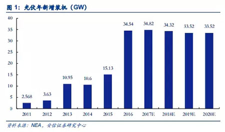 這就意味著,2017-2020這四年,每年我國的平均裝機量會在34Gw以上,這這34Gw包含的是約22Gw的地面電站,以及12Gw的地面電站。