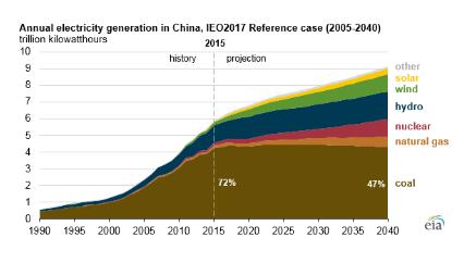 根據美國能源信息署(EIA),未來幾十年,可再生能源在中國發電量中的占比將增長,而燃煤發電的份額將從2015年的72%降至2040年的47%。