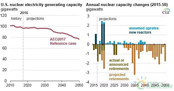 但根據美國能源情報署發布的2017年度能源展望顯示,到2050年,25%的現役核電站由于工作年限等問題將被淘汰。