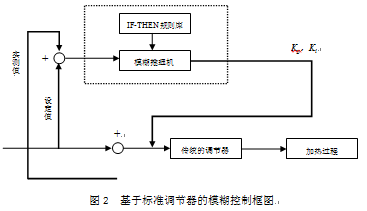 加熱爐燃燒控制是一個(gè)操作范圍較廣的復(fù)雜系統(tǒng),單獨(dú)的PID控制系統(tǒng)不能完全滿足于整個(gè)燃燒控制系統(tǒng),為更好的達(dá)到加熱效果及控制燃燒要求,并基于節(jié)省能源的控制基礎(chǔ)上,模糊邏輯控制系統(tǒng)是在標(biāo)準(zhǔn)的PID控制器的基礎(chǔ)上研發(fā)并得到實(shí)踐應(yīng)用產(chǎn)生的,斯坦因加熱爐通過(guò)優(yōu)化爐子的加熱溫度設(shè)定點(diǎn),利用熱量物理模型計(jì)算爐內(nèi)鋼坯坯料的溫度,并通過(guò)控制模型計(jì)算的加熱爐各區(qū)域期望的最適宜的溫度,使鋼坯坯料達(dá)到目標(biāo)溫度。標(biāo)準(zhǔn)調(diào)節(jié)器的模糊系統(tǒng)基本框圖如圖2所示。