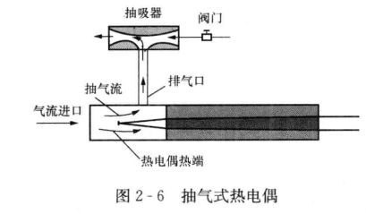 圖2-6是一種抽氣式熱電偶。為消除氣流速度波動對測溫產生的影響,抽氣式熱電偶裝有一抽吸器,抽吸器以水、蒸汽、壓縮空氣為動力產生抽吸力,只要保證抽吸力恒定,就可以保證通過熱電偶熱端時的氣流速度恒定。帶水冷套的抽氣式熱電偶適用于大型鍋爐火焰氣流和粗管排煙氣流的溫度測量(見圖2-7)。