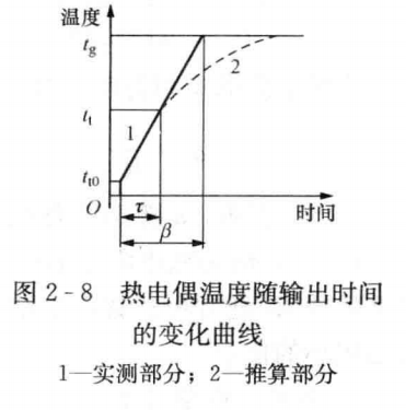 2)動態法測量高溫氣流溫度。靜態方法測溫實質是熱電偶與被測氣流達到熱平衡之后來度量氣流的溫度,各類熱電偶只能在量程范圍內工作,否則就會損壞。而采用動態法,可以測量超過熱電偶量程范圍的溫度。例如,國內外已經達到用鎳鉻一鎳硅熱電偶測量出2000~3000℃的高溫,甚至是高達10000℃的等離子體的溫度。動態法測溫原理是,將裸露的熱電偶迅速插入氣流中,熱端在氣流的加熱下溫度升高,但是達到該熱電偶允許使用的上限溫度之前就迅速將其抽出,利用熱電偶從插入氣流到抽出這段時間的輸出變化曲線(見圖2-8),測出氣流的真實溫度。