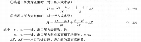 2)揚程測量。水泵揚程的測量應有兩個測點,即水泵進口壓力和出口壓力。當泵為吸入式工作狀態時,進口側(水井或水池)水位低于水泵軸線,進口為負壓,采用真空壓力表或U形管壓力計測量進口壓力;當泵為壓入式工作狀態時,進口側水池水位高于水泵軸線,可采用壓力表或U形管壓力計測量進口壓力。進、出口壓力表安裝位置高度差用米尺測量。進、出口液體流速按照流量測量值和管道截面積計算平均流速。