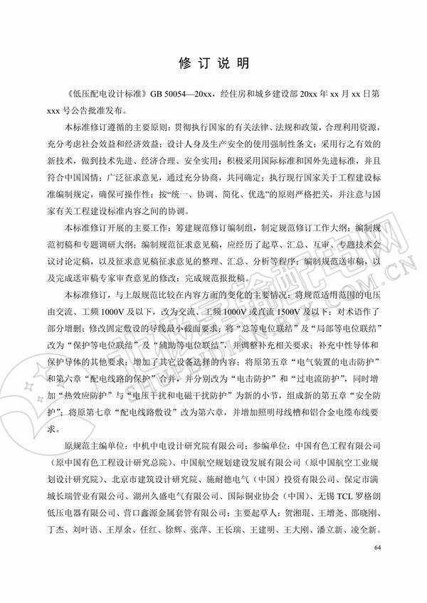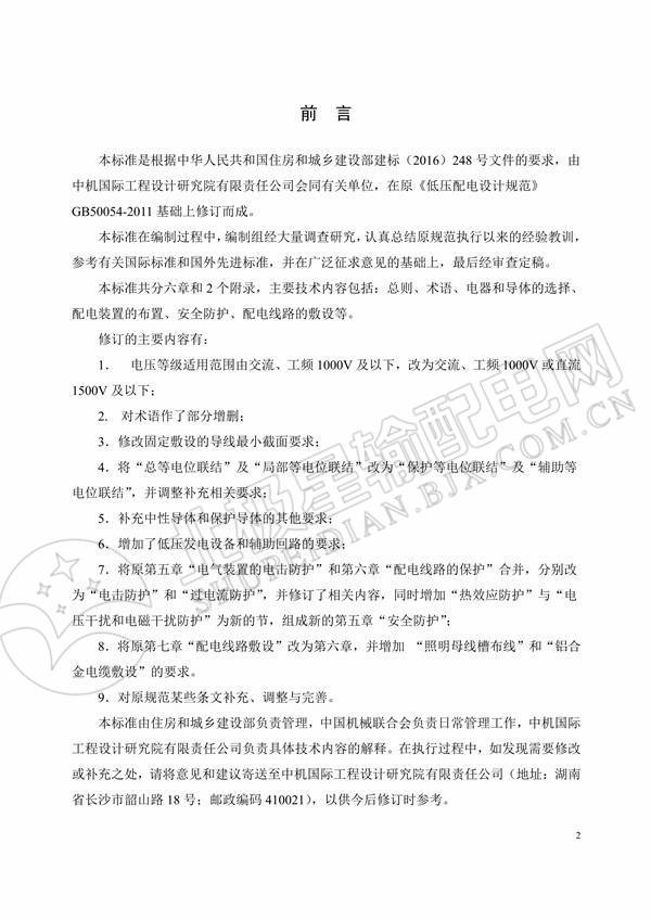 本標準是根據中華人民共和國住房和城鄉建設部建標(2016)248 號文件的要求,由中機國際工程設計研究院有限責任公司會同有關單位,在原《低壓配電設計規范》GB50054-2011 基礎上修訂而成。