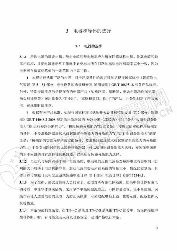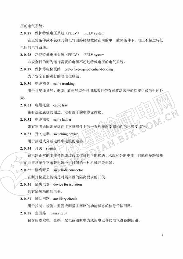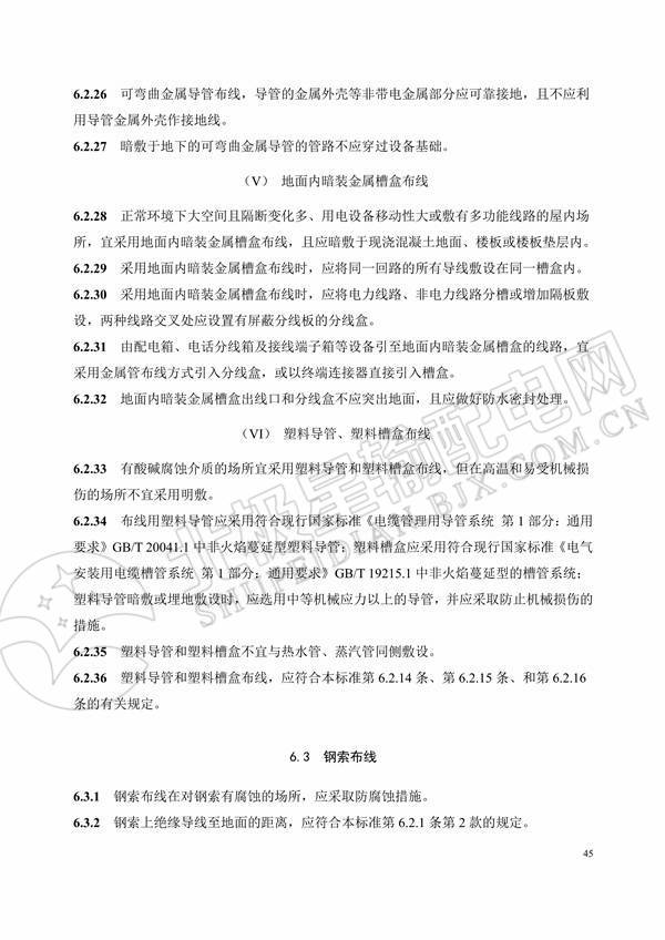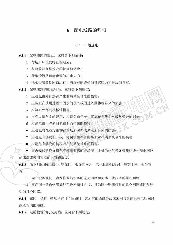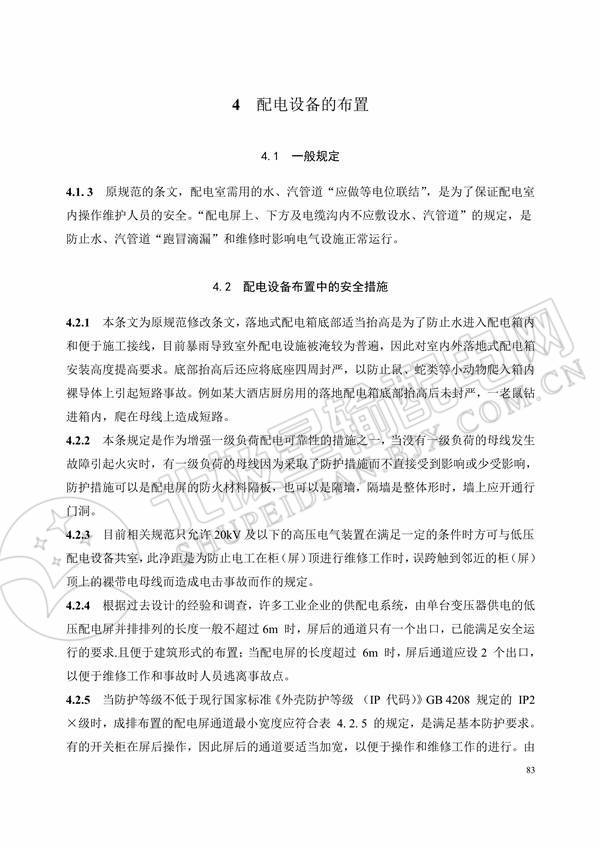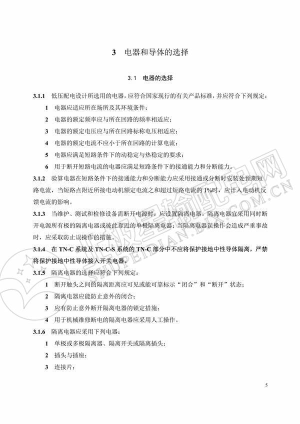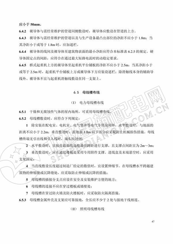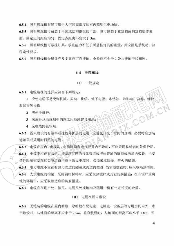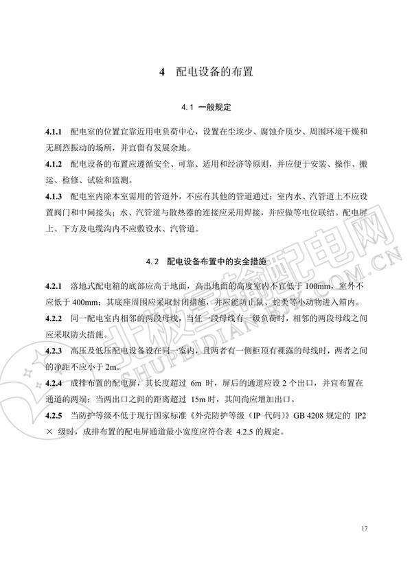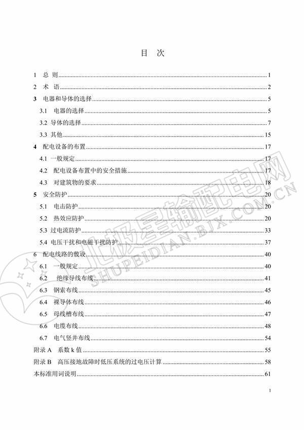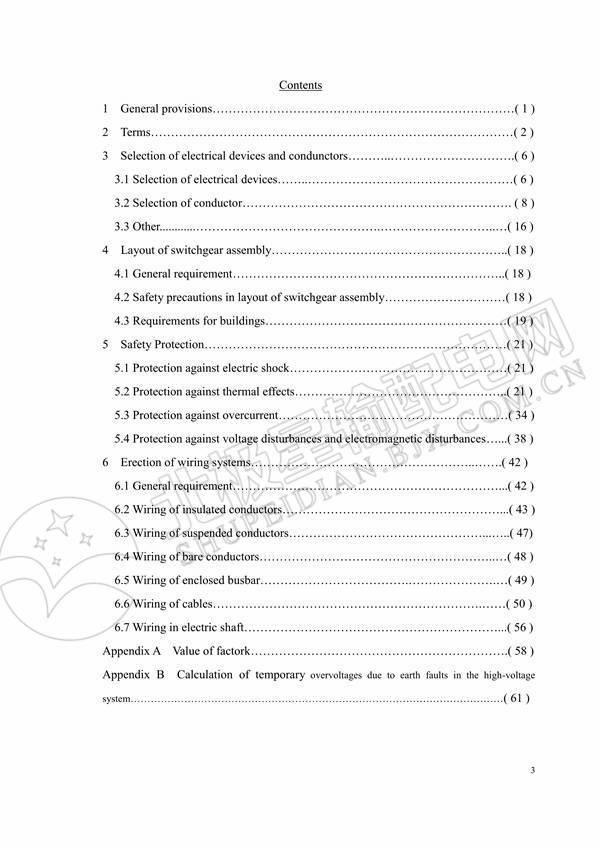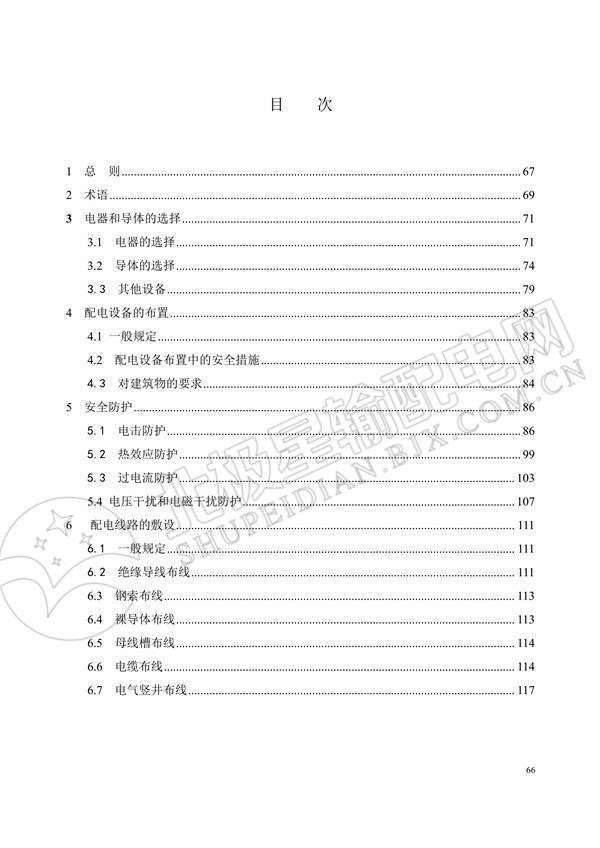 本標準共分六章和2 個附錄,主要技術內容包括:總則、術語、電器和導體的選擇、配電裝置的布置、安全防護、配電線路的敷設等。