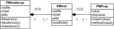 在某個(gè)具體的應(yīng)用中,涉及的對(duì)象可以是單個(gè)對(duì)象實(shí)例,也可以是多個(gè)對(duì)象實(shí)例。為在數(shù)據(jù)表現(xiàn)層中實(shí)現(xiàn)一個(gè)或多個(gè)對(duì)象實(shí)例的統(tǒng)一處理,我們定義了PMInstArray類。PMInstArray類提供了對(duì)象管理方法:包括新增、刪除、修改,及整體頁面定義和操作定義等等。