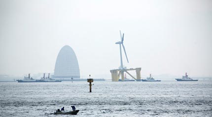 浮體式風(fēng)車于9點(diǎn)準(zhǔn)時(shí)從“海螢火蟲”旁邊經(jīng)過,和預(yù)定絲毫不差。巨大的風(fēng)車從油輪和漁船之間穿過的風(fēng)景實(shí)在是蔚為壯觀。