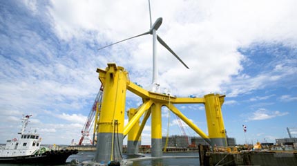 設(shè)置在浮體上的風(fēng)車由日立制作所制造。基本結(jié)構(gòu)與建在陸地上的風(fēng)車相同,但為了能承受海上的強(qiáng)風(fēng),風(fēng)車塔采用了越向下越粗的結(jié)構(gòu),這也是其特點(diǎn)所在。