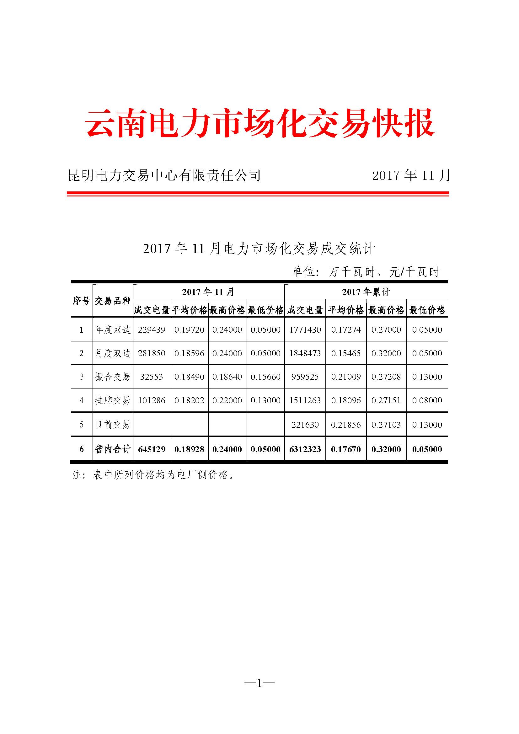 11月1日,昆明電力交易中心發布了《云南電力市場化交易快報(2017年11月)》,2017年年度雙邊成交電量229439萬千瓦時,月度雙邊成交電量281850萬千瓦時,撮合交易32553萬千瓦時。以下為全文:
