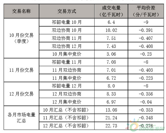 通過雙邊協商交易和集中競價交易,10-12 月累計成交市場電量 57.05 億千瓦時,平均價差-0.32 分/千瓦時,電廠側讓利約 1817 萬元。其中雙邊協商交易成交 40.30 億千瓦時,平均