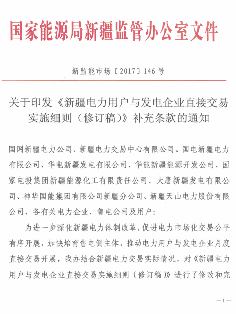 新疆電力用戶與發電企業直接交易實施細則的補充條款發布
