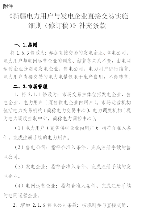 國家能源局新疆監管辦日前發布了《新疆電力用戶與發電企業直接交易實施細則(修訂稿)補充條款的通知》,通知中稱,對實施細則的10個部分內容進行了修改和完善,增加了相關補充條款。詳情如下: