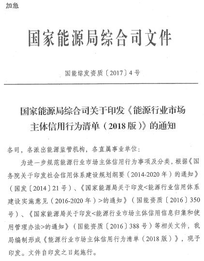 能源局發布《能源行業市場主體信用行為清單(2018版)》