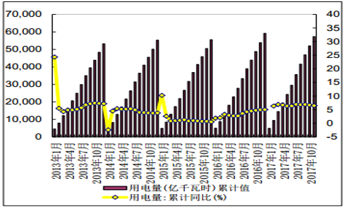 2017年1-11 月份,全國(guó)全社會(huì)用電量 57331 億千瓦時(shí),同比增長(zhǎng) 6.5%,增速比上年同期提高 1.5 個(gè)百分點(diǎn)。1-11 月份,第一產(chǎn)業(yè)用電量 1074 億千瓦時(shí),同比增長(zhǎng) 7.1%,占全社會(huì)用電量的比重為 1.9%;第二產(chǎn)業(yè)用電量 40185 億千瓦時(shí),同比增長(zhǎng) 5.5%,增速比上年同期提高 2.9 個(gè)百分點(diǎn),占全社會(huì)用電量的比重為 70.1%,對(duì)全社會(huì)用電量增長(zhǎng)的貢獻(xiàn)率為 59.8%;第三產(chǎn)業(yè)用電量 8054 億千瓦時(shí),同比增長(zhǎng) 10.5%,增速比上年同期回落1.1 個(gè)百分點(diǎn),占全社會(huì)用電量的比重為 14.0%,對(duì)全社會(huì)用電量增長(zhǎng)的貢獻(xiàn)率為 21.9%;城鄉(xiāng)居民生活用電量 8018 億千瓦時(shí),同比增長(zhǎng) 7.7%,增速比上年同期回落 3.8 個(gè)百分點(diǎn),占全社會(huì)用電量的比重為 14.0%,對(duì)全社會(huì)用電量增長(zhǎng)的貢獻(xiàn)率為 16.3%。