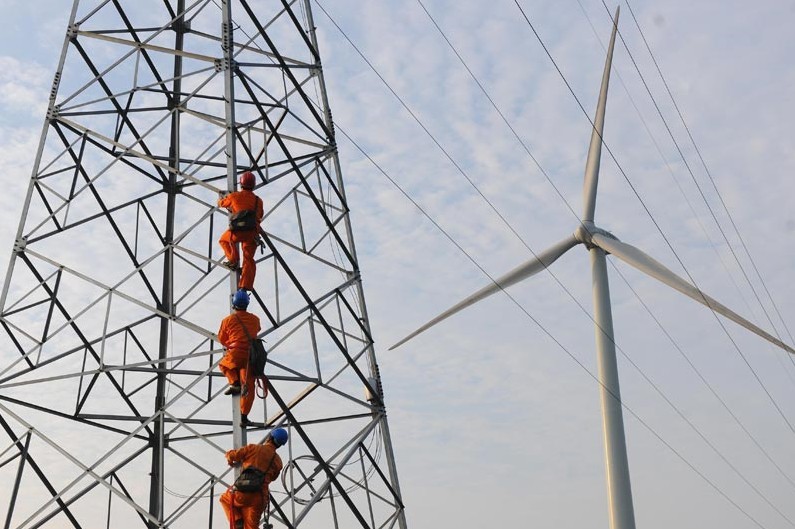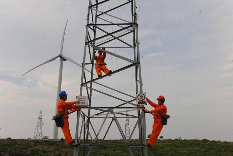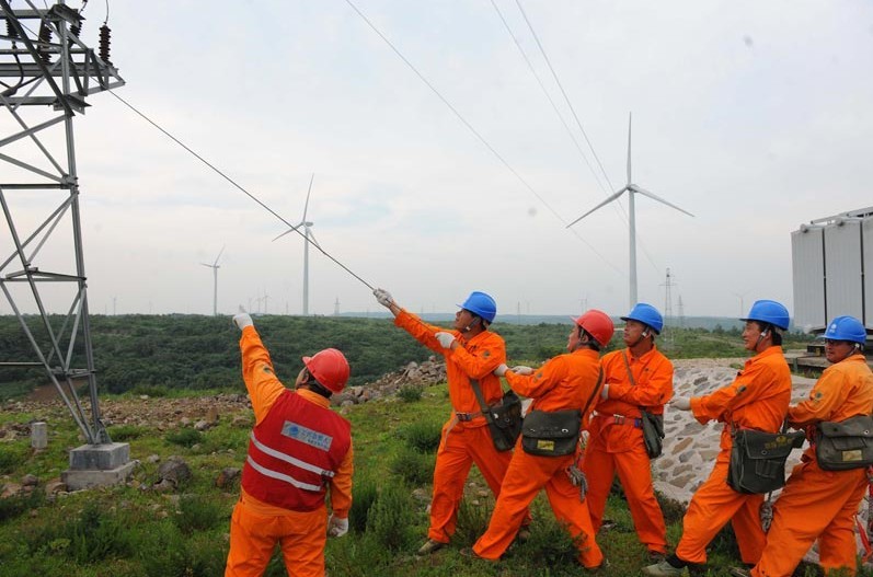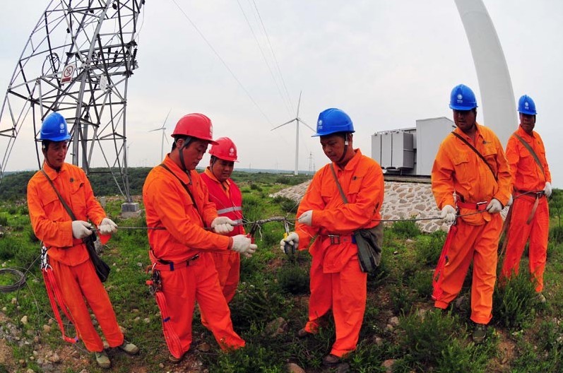 2013年7月8日,安徽省明光市電力工程技術人員在龍源風力發電場為一臺風機更換故障電線。當日,安徽電網風電發電量累計達10 68億千瓦時,風力發電全部優先上網并消納。安徽風電每日發電量達30萬千瓦時,有效緩解