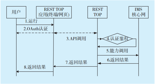 2)瀏覽模式。瀏覽模式是用戶通過瀏覽器在網頁上使用內嵌應用的模式,對批量使用能力的情況進行記費。注冊成為用戶,通過網頁提供應用服務。普通用戶通過瀏覽網站,直接點擊運行網站提供的應用。瀏覽模式下的API使用流程描述如下:用戶瀏覽頁面時運行應用;REST TOP應用進行API調用,攜帶網站的USER_ID(號碼、密碼)、DEV ID以及APP_ID;REST TOP進行認證鑒權;REST TOP調用網絡能力;IMS網絡返回結果;REST TOP返回調用結果給APP應用客戶端;APP應用客戶端返回結果給用戶。
