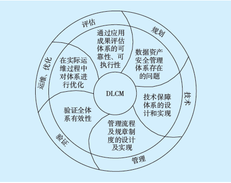 上述目標必須納入數據資產安全管理體系中,在職責明確、分級明晰的框架指導下,才能最大程度地發揮其約束作用。尤其是,要做到數據資產的安全管理,必須在數據分類分級機制、數據全生命周期管理(Data Life Cycle Management,DLCM)、數據使用授權體系規范管理的前提下,由相關人員在權限范圍內對數據進行訪問及提取應用,其整體構成如