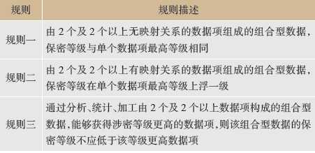 通常而言,孤立的一條數據或數條數據無法滿足實際業務需要,特別是在面對現在國家電網公司“打破數據壁壘,挖掘數據潛力”的需求前提下,更是如此。當數據牽涉到不同業務領域、由不同業務部門管理、且需要協同工作時,對組合型數據資產的保密定級就需要形成一套有效的定級方法,從而保證數據資產的安全性。上一章節中的保密等級,即是單個數據項的定級結果,結合每一項數據項的定級結果,通過一定的規則,就可以對組合型數據定級。事實上,單個數據項的定級相對較為簡單,通常是在數據可公開的維度上進行度量,其數據項保密分級定義見