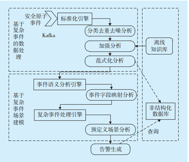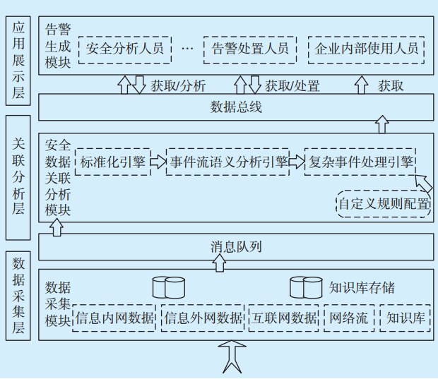 從海量安全日志中發現威脅,提取有效安全事件,生成安全告警供相關人員處置是企業內大數據安全管理平臺的研究熱點。在傳統的大數據安全管理平臺中,安全事件由安全分析人員人工研判,在數據關聯分析的實時性、準確性及個性化分析方面有所欠缺,同時還存在交互性弱的問題。為了完善及