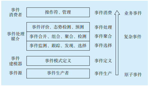 CEP處理框架反映的是原子事件進入事件處理引擎后通過一系列的操作,生成復雜事件直至最終事件的流程。復雜事件處理主要負責實時事件流的處理及不同事件流實時關聯分析。