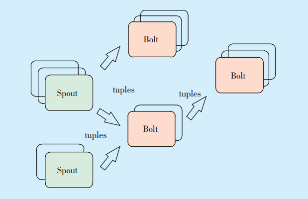 標準化引擎是對安全數據的過濾、分類、加強及范式化等數據分析工作,實現事件流的主題去重去噪分析、加強分析及范式化分析。該引擎是事件流的標準化分析環節的引擎,業務邏輯是依據不同數據的特性預置的,不需要人工自定義規則,不必結合Esper技術使用EPL語句進行處理,利用Storm框架的高吞吐率,采用Storm的技術架構[12],加快事件流的處理速度。Storm采用實時計算的圖狀結構,圖在Storm中成為拓撲。每個拓撲提交給集群,由集群中的主控節點分發代碼,將任務分配給工作節點執行。一個拓撲中包括spout和bolt 2種角色,其中spout發送消息,負責將數據流以tuple元組的形式發送出去;bolt則負責轉換這些數據流,在bolt中可以完成計算、過濾等操作,bolt自身也可以隨機將數據發送給其他bolt。由spout發射出的tuple是不可變數組,對應著固定的鍵值對。Storm框架如圖3