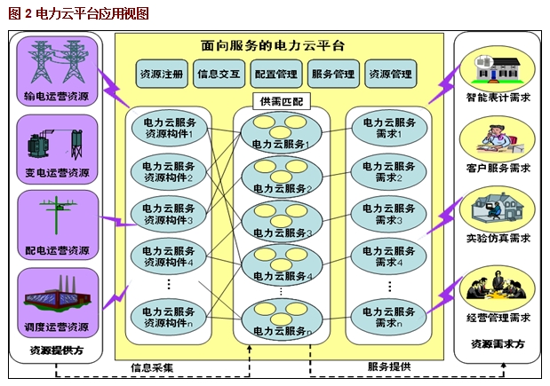 電力云平臺(tái)基于云服務(wù)資源構(gòu)件進(jìn)行高效、動(dòng)態(tài)的服務(wù)聚集、服務(wù)整合,從全局和局部的角度來進(jìn)行服務(wù)提供者和服務(wù)資源的匹配技術(shù)和優(yōu)化選擇算法,最后基于網(wǎng)絡(luò)提供電力云服務(wù)。在電力云平臺(tái)的支撐下,可實(shí)現(xiàn)全面支撐電力企業(yè)各個(gè)業(yè)務(wù)環(huán)節(jié)的應(yīng)用:首先是電力生產(chǎn)運(yùn)營(yíng)資源的共享與整合,信息采集可通過平臺(tái)進(jìn)行虛擬化云端接入,封裝形成虛擬化的資源,由電力云服務(wù)平臺(tái)統(tǒng)一進(jìn)行管理和控制,用戶的需求通過平臺(tái)需求發(fā)布、供需匹配尋找到所需服務(wù)資源。