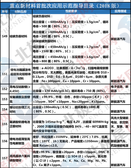 工信部近日公布《重點新材料首批次應用示范指導目錄(2018年版)》,其中包含鎳鈷鋁酸鋰三元材料、氟磷酸釩鋰電池正極材料、硅碳負極材料、鋰離子電池無紡布陶瓷隔膜、鋰電池隔膜涂布超細氧化鋁粉體材料等。