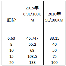 油價“2015年6.9L/100KM”“2010年5L/100KM”