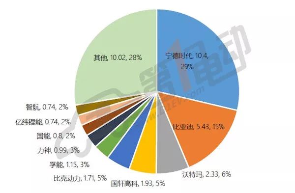 我們之前測經測算過2017年國內幾大動力電池企業的產品裝機量,也就是實實在在裝在車上的電池量。從總量上看,比亞迪和寧德時代這兩家企業瓜分了全國約44%的市場份額。