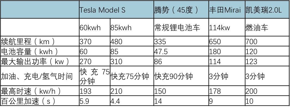 三元電池車、磷酸鐵鋰電池車、燃料電池車及燃油車參數(shù)對比
