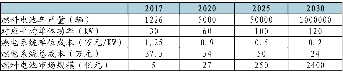 假設(shè)依據(jù)如下:根據(jù)2017年11月發(fā)布的《節(jié)能與新能源汽車技術(shù)路線圖》,我國燃料電池汽車的2020/2025/2030年的發(fā)展目標分別為5,000/50,000/1,000,000輛。