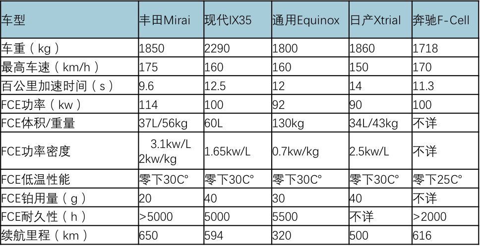 主流FCV參數(shù)對比